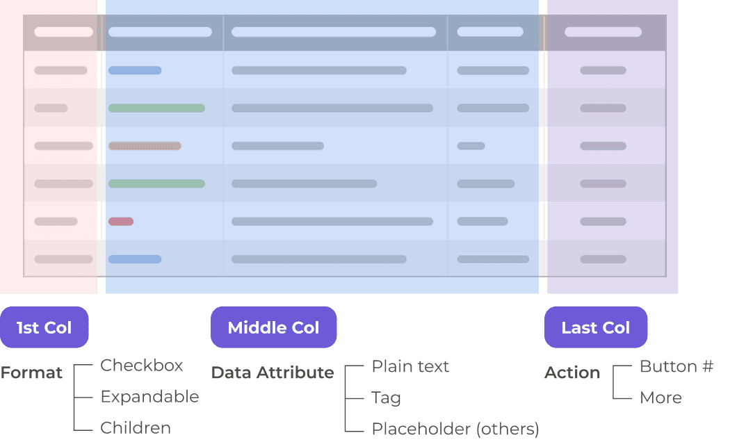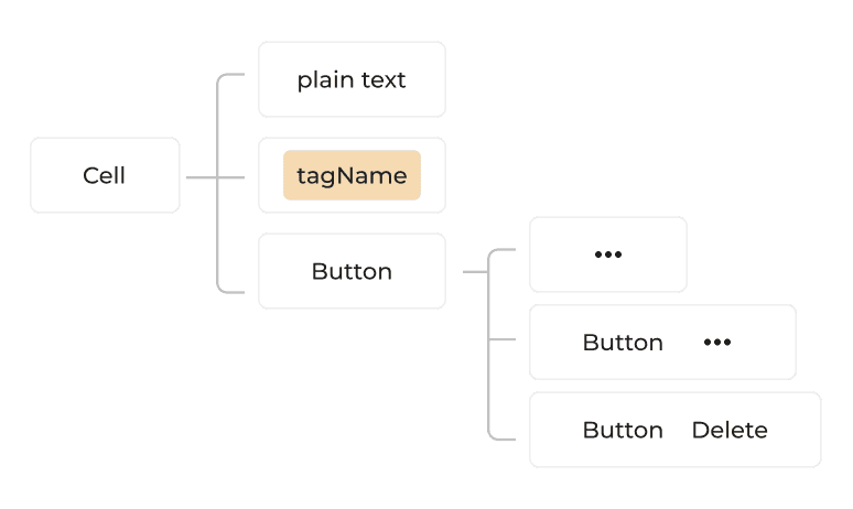 Each content cell can be composed of three types of elements: text, tags, action buttons. This ensured every cell could be assembled in a consistent, predictable way, regardless of the table’s complexity.